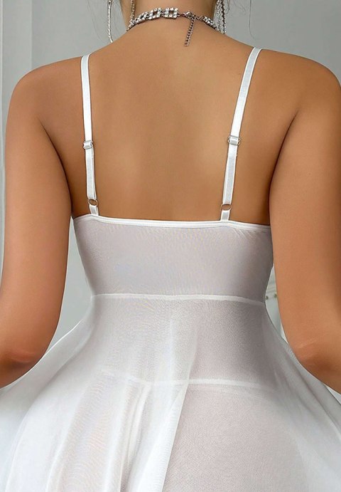 Captivate your sweetheart in this playful babydoll set featuring sheer lace cups with a scalloped trim, flirty criss-cross strappy bust details, and adjustable spaghetti straps. The flowing sheer mesh skirt adds a touch of allure, while the matching G-string completes the irresistibly charming look.